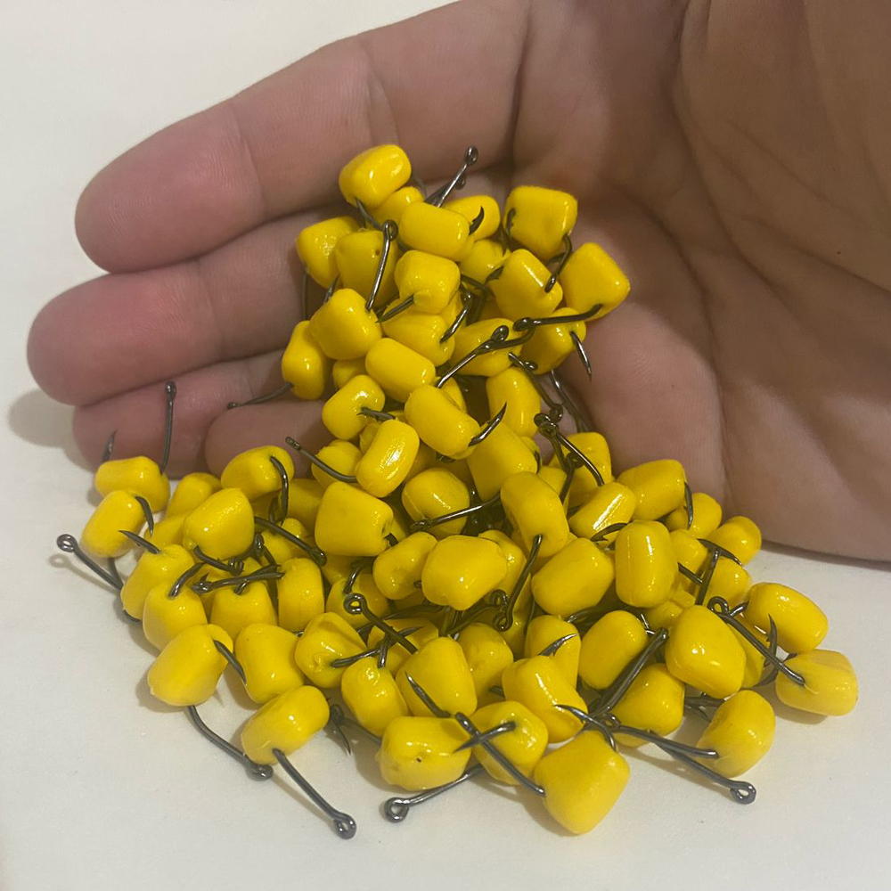 Isca macia e realista que imita a aparência e aroma de um grão de milho natural, ideal para atrair tilápias, carpas e outros peixes.